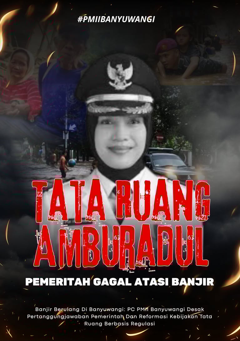Banyuwangi, Februari 2026 — Pengurus Cabang Pergerakan Mahasiswa Islam Indonesia (PC PMII) Banyuwangi secara resmi menyatakan keprihatinan mendalam atas kejadian banjir yang kembali melanda sejumlah wilayah di Kabupaten Banyuwangi dalam beberapa pekan terakhir. Peristiwa ini bukan semata-mata akibat curah hujan tinggi, melainkan merupakan akumulasi kegagalan sistemik dalam perencanaan tata ruang, lemahnya penegakan hukum terhadap pelanggaran alih fungsi lahan, serta absennya pendekatan mitigasi bencana yang terstruktur dan berbasis regulasi.